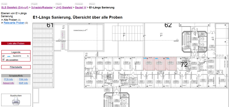Die Vorteile der internetbasierten Plattform liegen darin, dass jeder Autorisierte den passwortgeschützten Bereich betreten kann, um sich einzelne Räume oder Bauteile, an denen gearbeitet werden muss, direkt anzusehen. Der Projektverantwortliche kann Objekte gezielt nach definierten Schadstoffen oder Sanierungsdringlichkeiten durchsuchen. Sanierte Bereiche können dabei angezeigt werden.