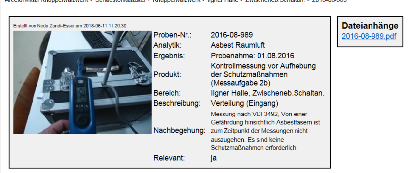 Weitergehende Informationen (z.B. Bewertung, Fotos und Prüfberichte der Labore als pdf-Dokument) werden über das Kataster verlinkt und über Mausklick aufgerufen. Darüber hinaus können aus der Datenbank Daten abgefragt und entsprechend der Filtereinstellungen Listen erzeugt werden.Um Ihre Datenbank immer auf dem neuesten Stand zu halten, übernehmen wir auf Wunsch die Pflege und Bearbeitung der internetbasierten Plattform sehr gerne. Sprechen Sie uns an!